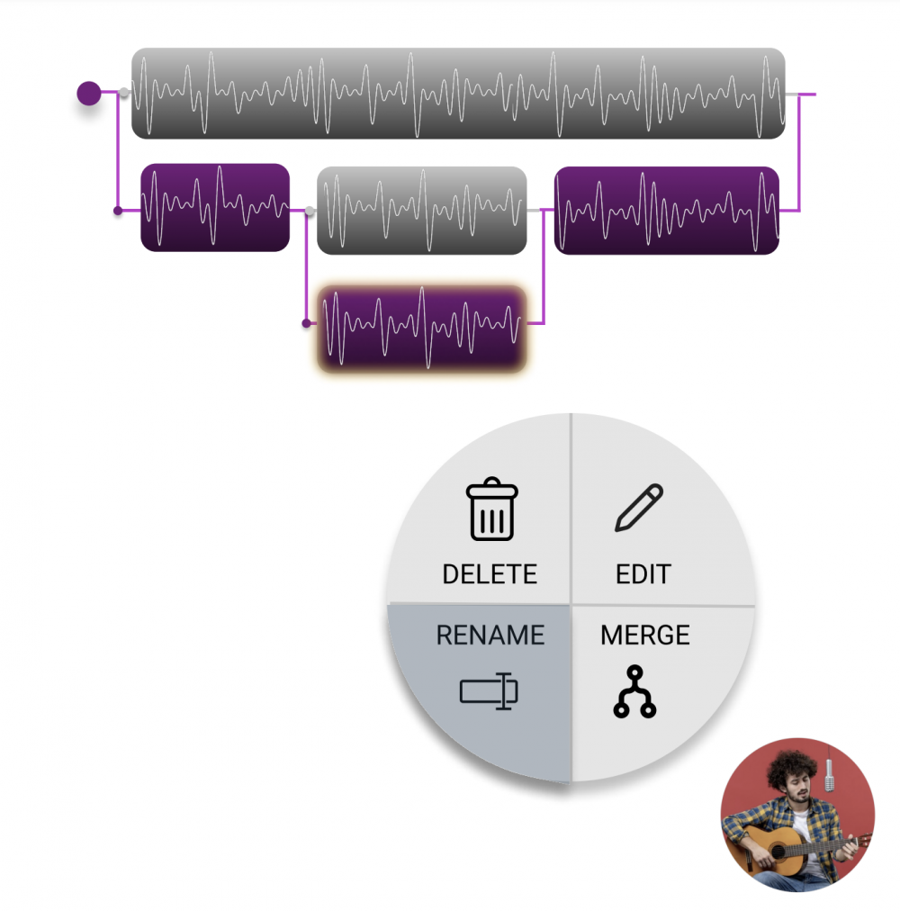Bob creates a sub-branch to experiment with the guitar solo. After recording it again, he opens the radial menu by right-clicking to rename it.