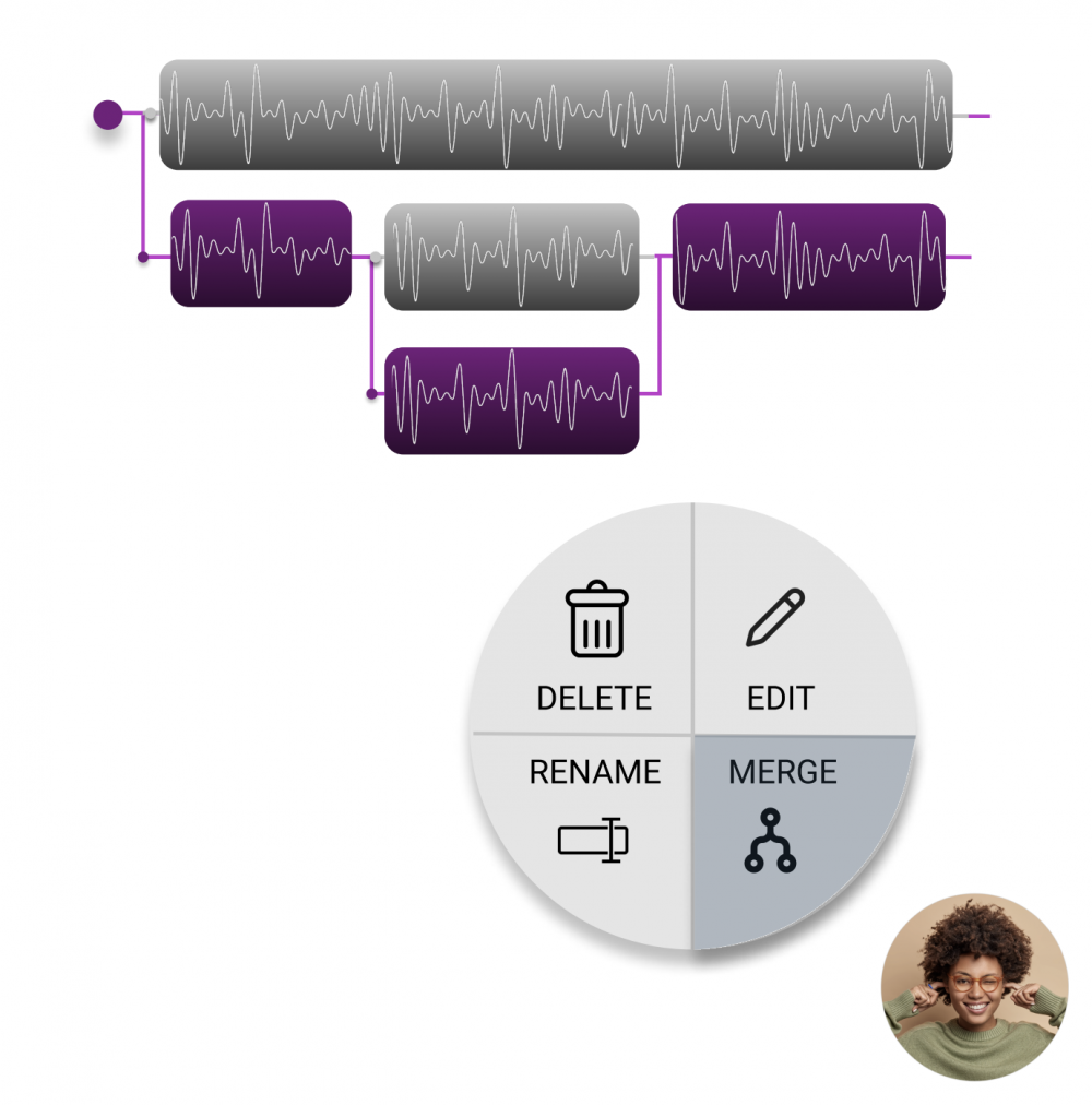 From the radial menu, Kate finally selects "Merge" and all the active branches are going to be merged together in the final version of the soundtrack.