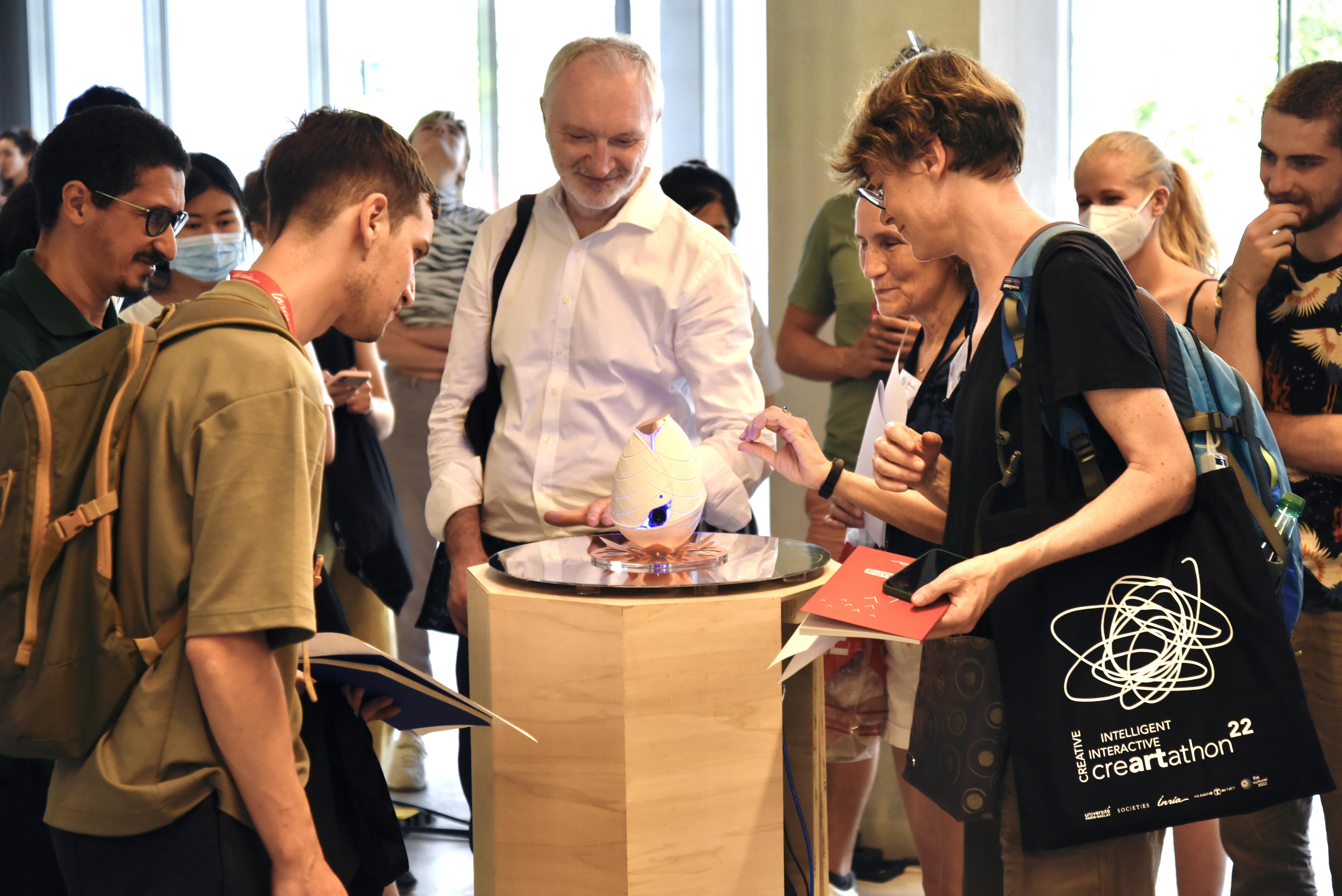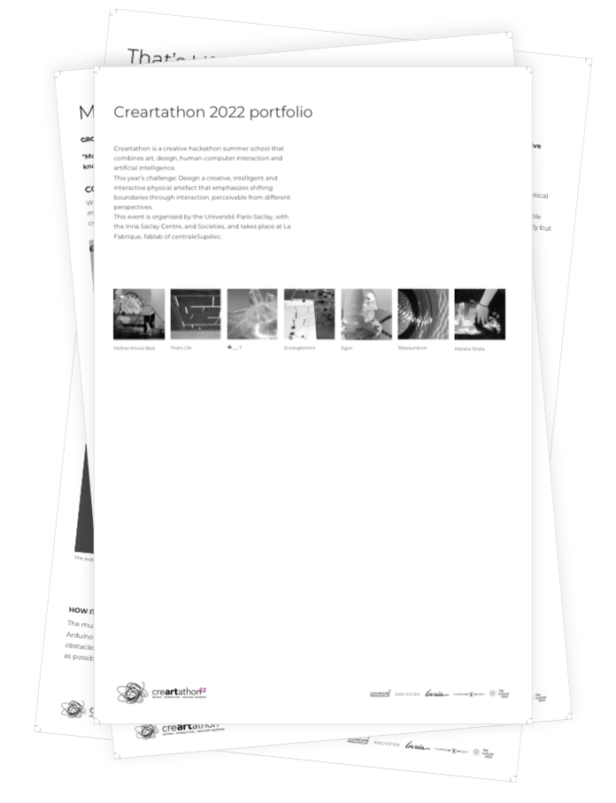 The Inria creartathon combines art and science in a Creative Hackathon where multi-disciplinary teams of five students collaborate on the design of a intelligent interactive object. This year’s challenge: Designing a creative, intelligent & interactive artifact that creates a true human-computer partnership. This event is organised by the Université Paris-Saclay, with the Inria Saclay Centre, and Societies, and takes place at La Fabrique, fablab of centraleSupélec.